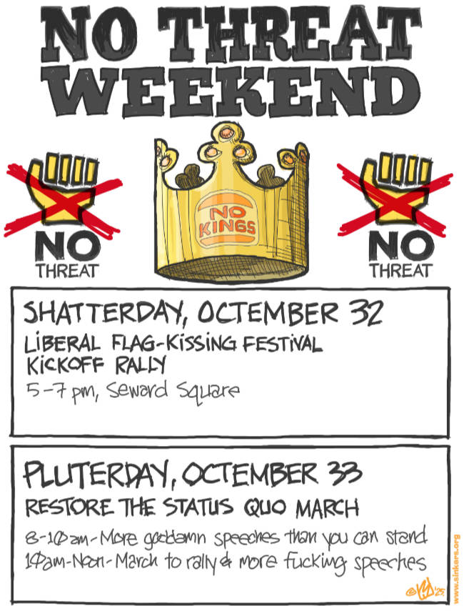 For real, Ms. J. I almost feel personally insulted every time these flyers hit the streets in my neighborhood for their goddamn fake-ass astroturf “movement” which seems to roll into town at least once per quarter, as if trying to make a fundraising goal. My first thought was “Christ, weren’t these assholes just in town this summer?” – and we’ve got a whole fresh load of astroturf being rolled out next week, and we haven’t even had a chance to wash the stink off the Mall from the last “No Kings” flag-kissing festival.