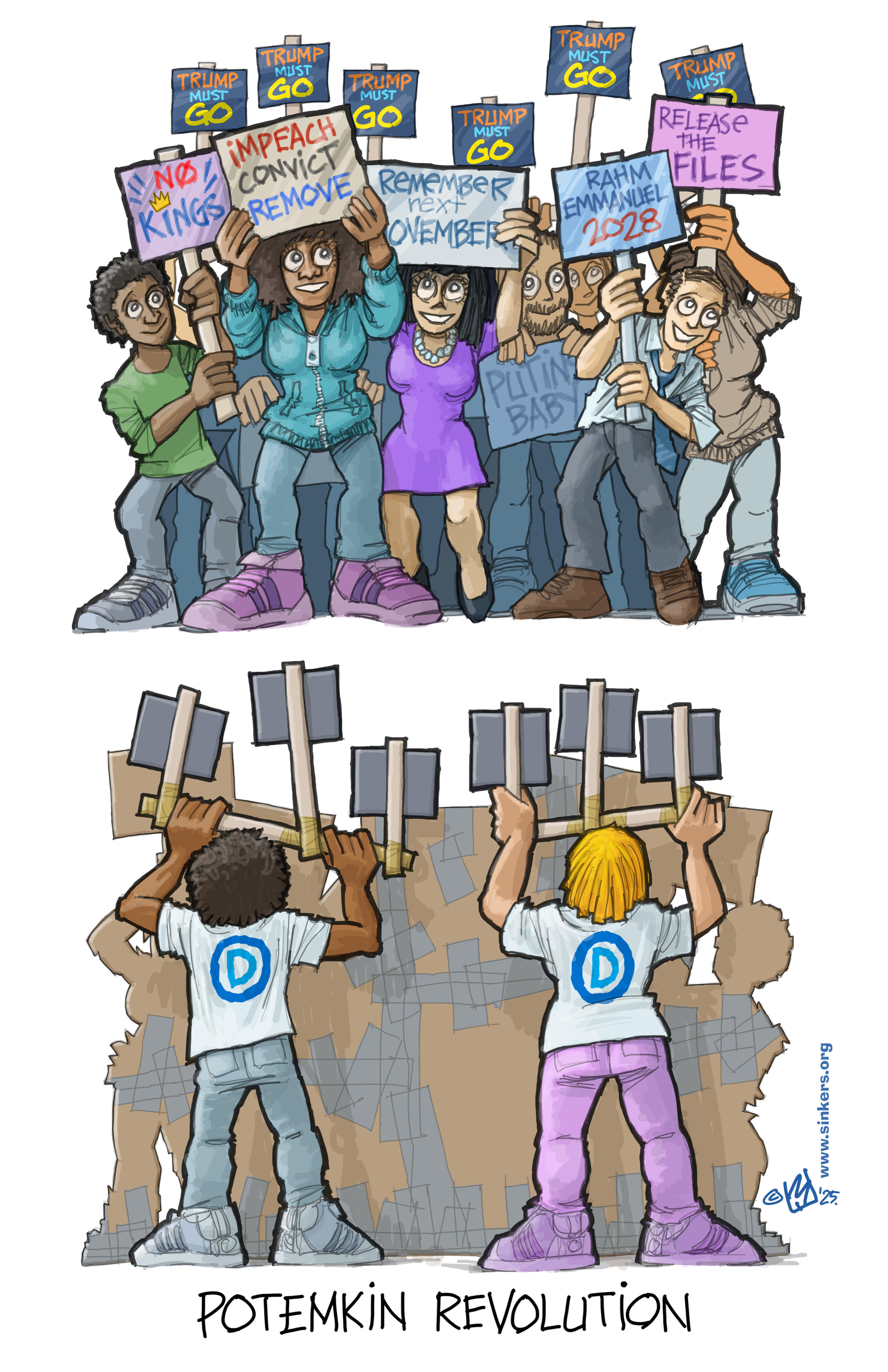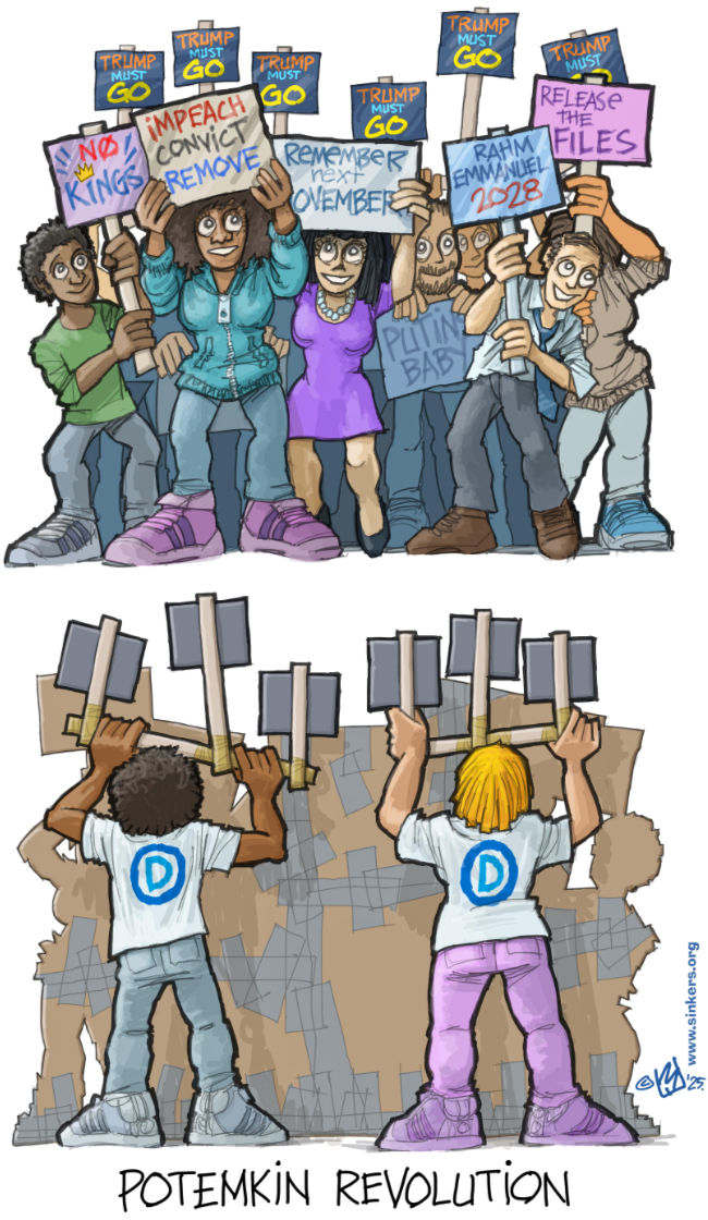 This is from the same blast of inspiration which coughed up the “No Kings” flyer parody, and my disgust/amusement at the continuous parade of half-assed Democratic astroturf “Potemkin Revolutions” through my city, such as the latest partisan bitchfest headed our way next week.