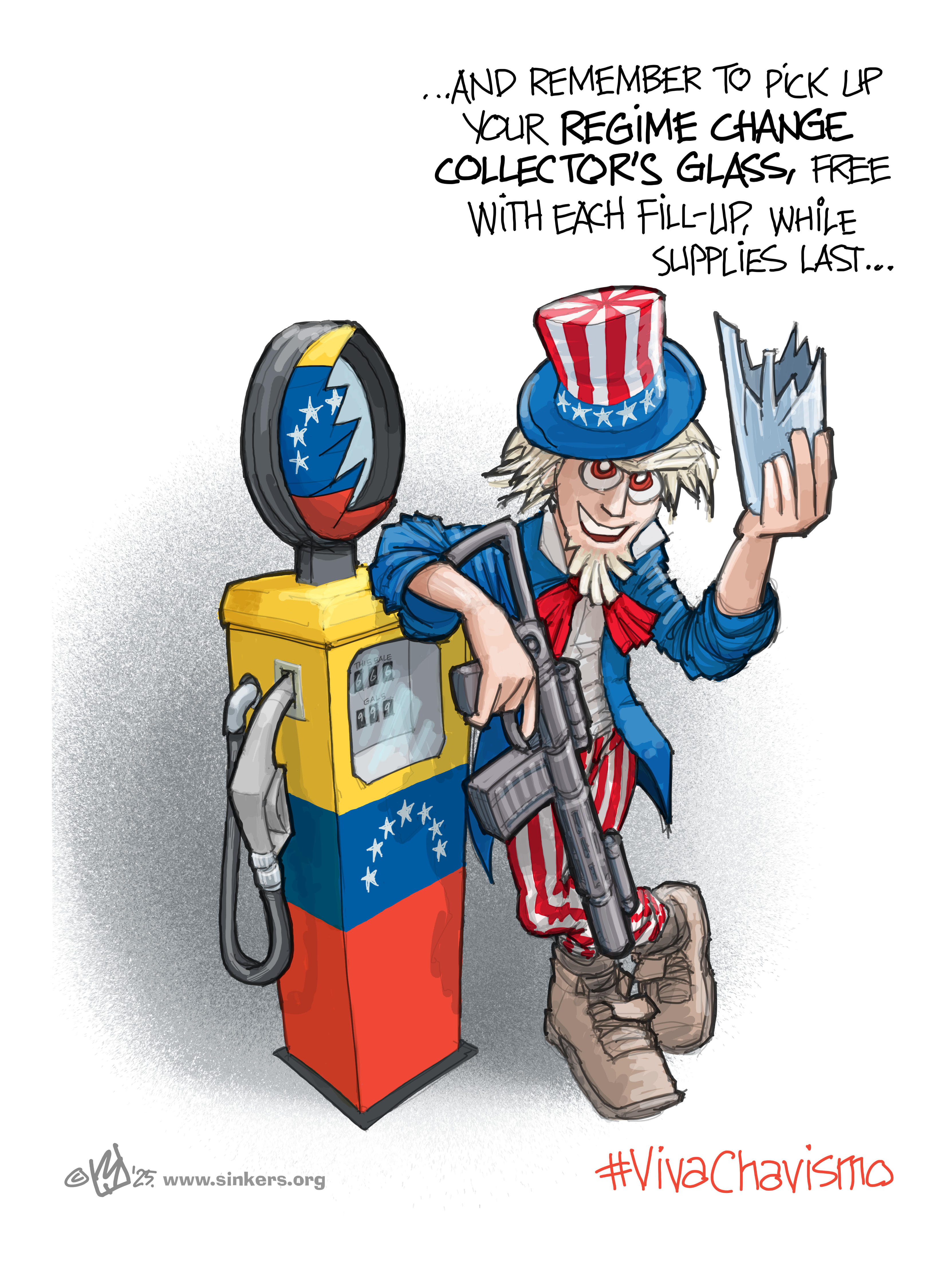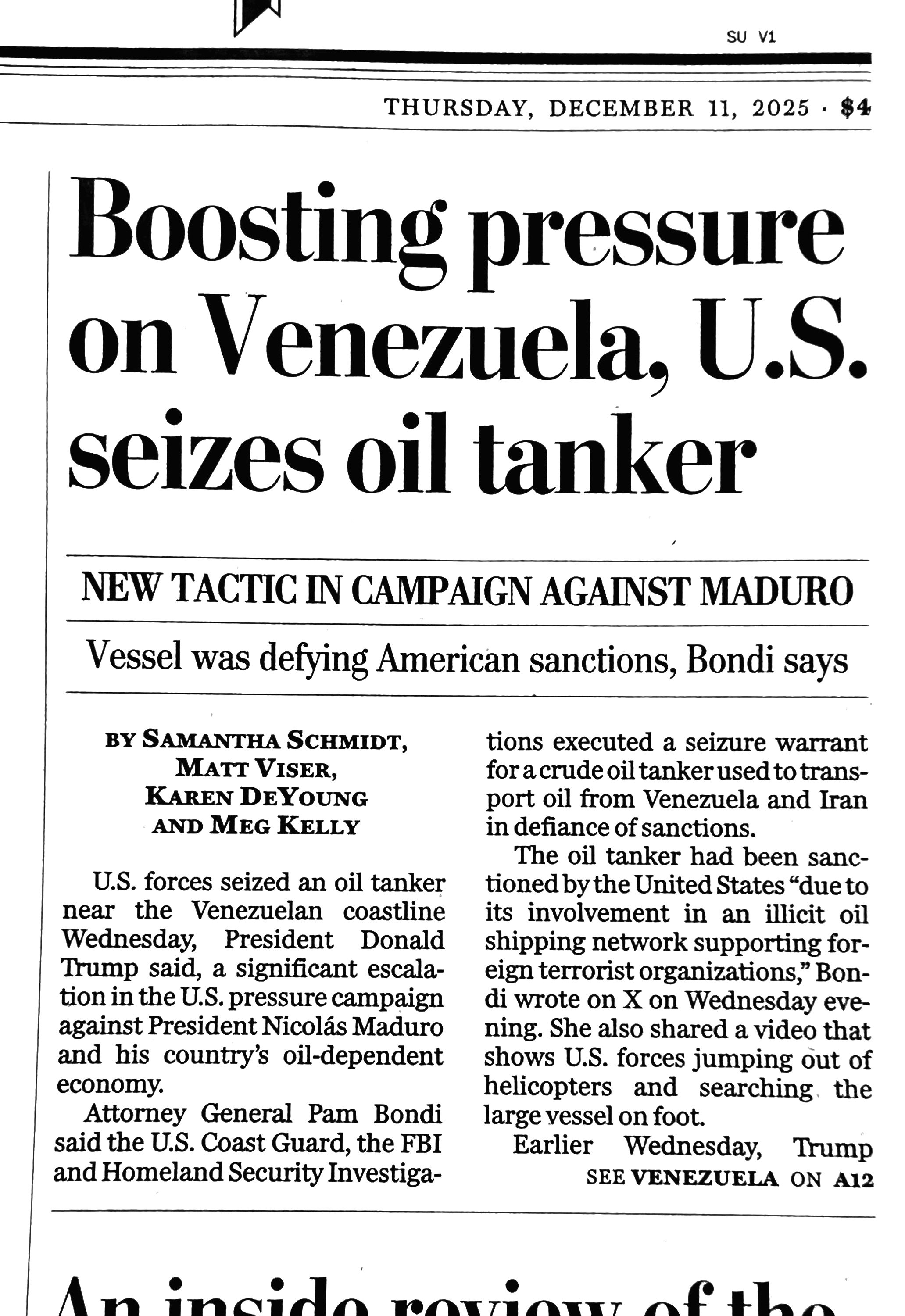 But, let’s just put those old giggles aside for now, and take ourselves a zesty, steamy gawk at the front page of Pravda On The Potomac from last Thursday (as I write this) – or, as I called it, the “Venezuela Special”. JEEEEzus CHRIST, willya LOOK at that goddamn mess. The main head on the front-page lead piece on the Donster’s latest yo-ho-ho’ing looks as if they’re in on the Cheer For Bullying, Piracy And Thievery Without Actually Cheering For Bullying, Piracy And Thievery Challenge – nothing if not the internal agonizing and mental pretzel-twisting of my imperialist Liberal friends’n’fam made publicly visible. They’re actually in favor of something the Donster is doing, and so they’re just going all splungy. So, what’s he gonna do with the goddamn tanker, now – open his own gas-station chain? “TrumpGas”? He’s already started up his own social-media site and plastered his name all over all kinds of shit, why not gas stations? “You can trust your car to the man who…”