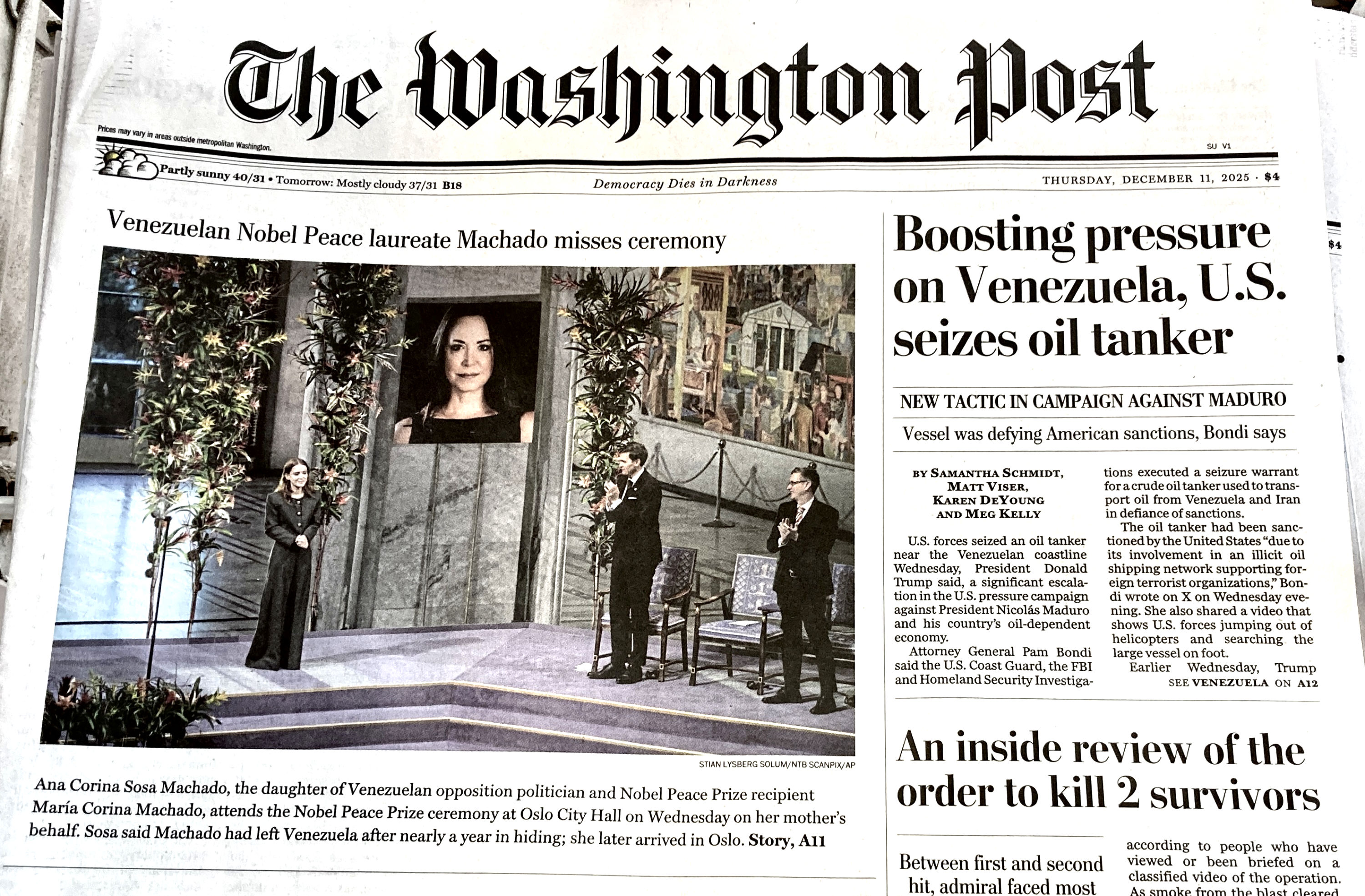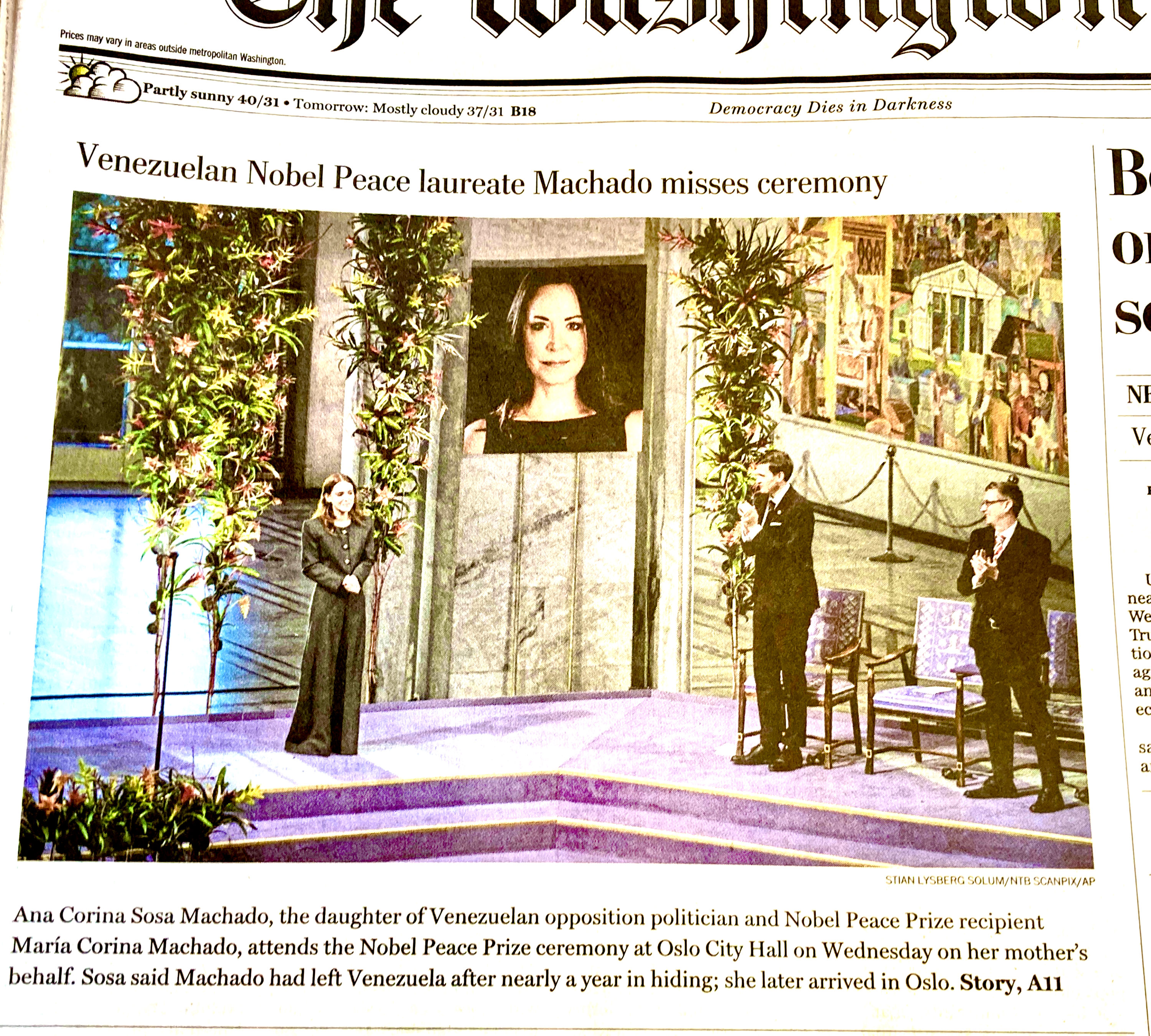 …but, enough of that; let’s move on to the featured foto on the left, where the true hilarity ensues – in which The Courageous Venezuelan Opposition Leader* Who Looks Like The Villainess In A Telenovela And Who Begged Trump To Invade Her Country And Who Can’t Come Out Of Hiding To Accept Her Cracker Jack Peace Prize Sends Her Daughter Instead.